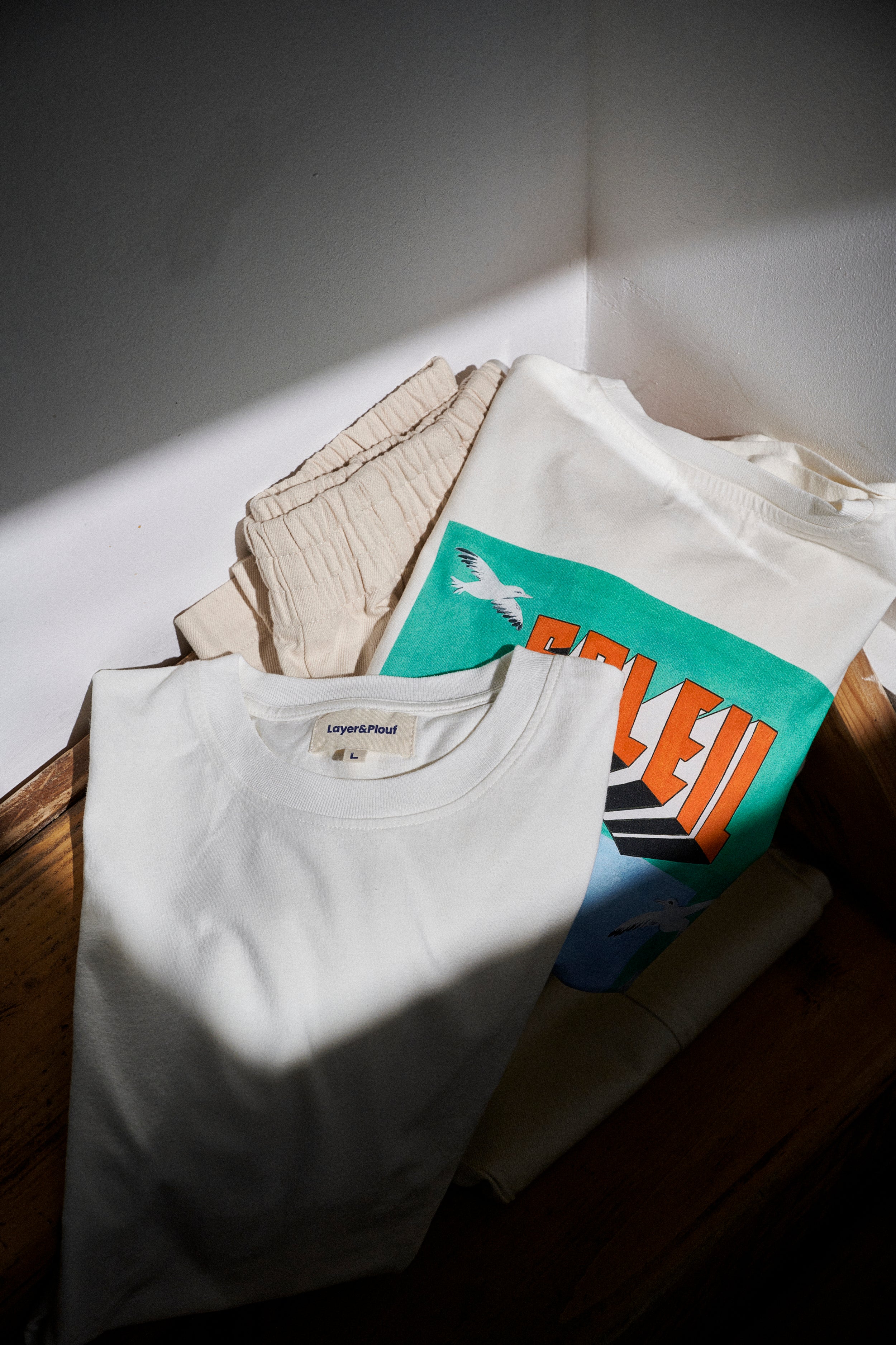 Pour ce drop 1 2024 : un pantalon et une veste en coton super épais - fabriqués au Portugal et en coton GOTS - aux couleurs naturelles sans coloration. Un tee-shirt oversize pour enfiler sur la plage - un peu de Marseille sur la peau.