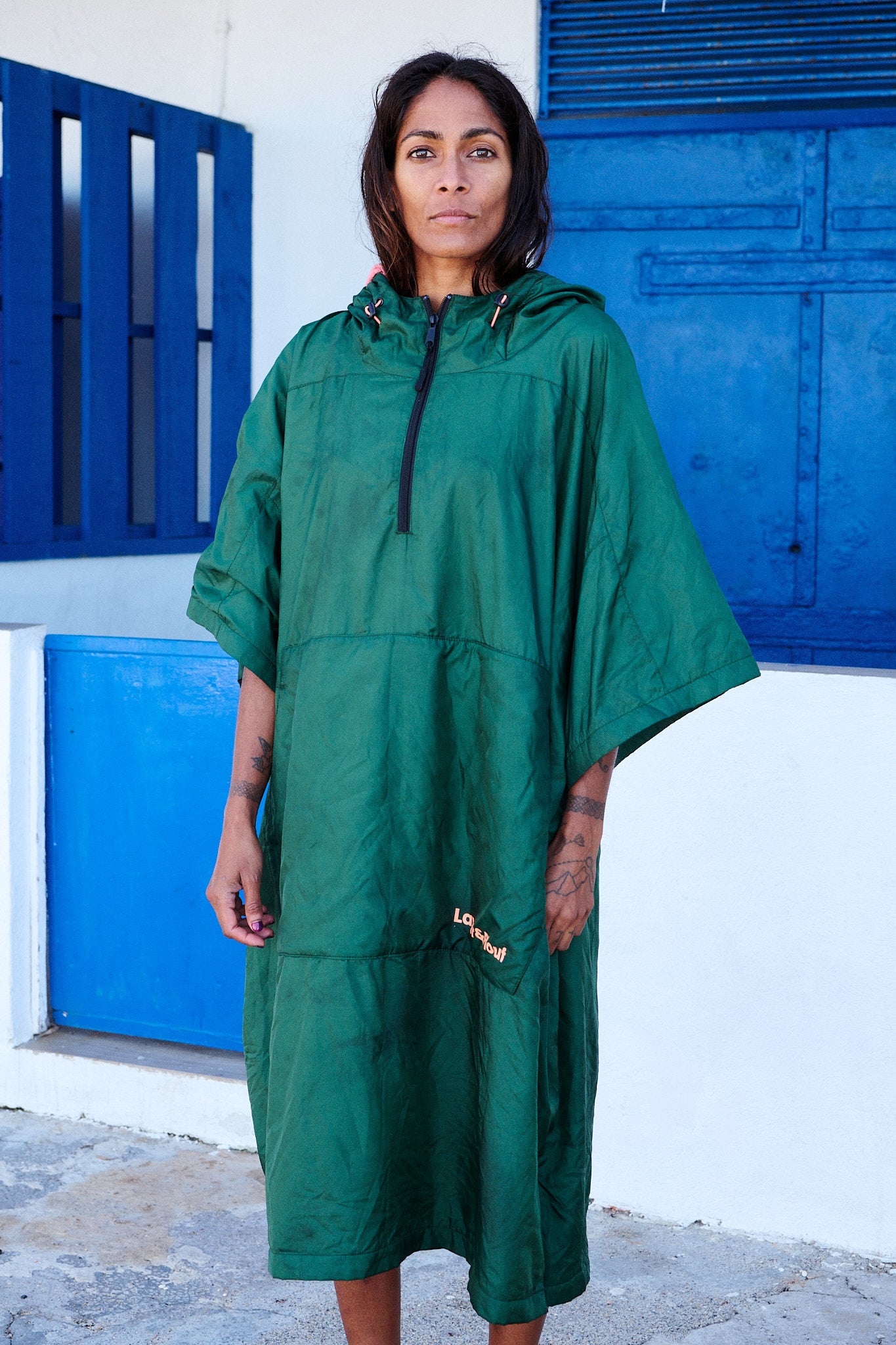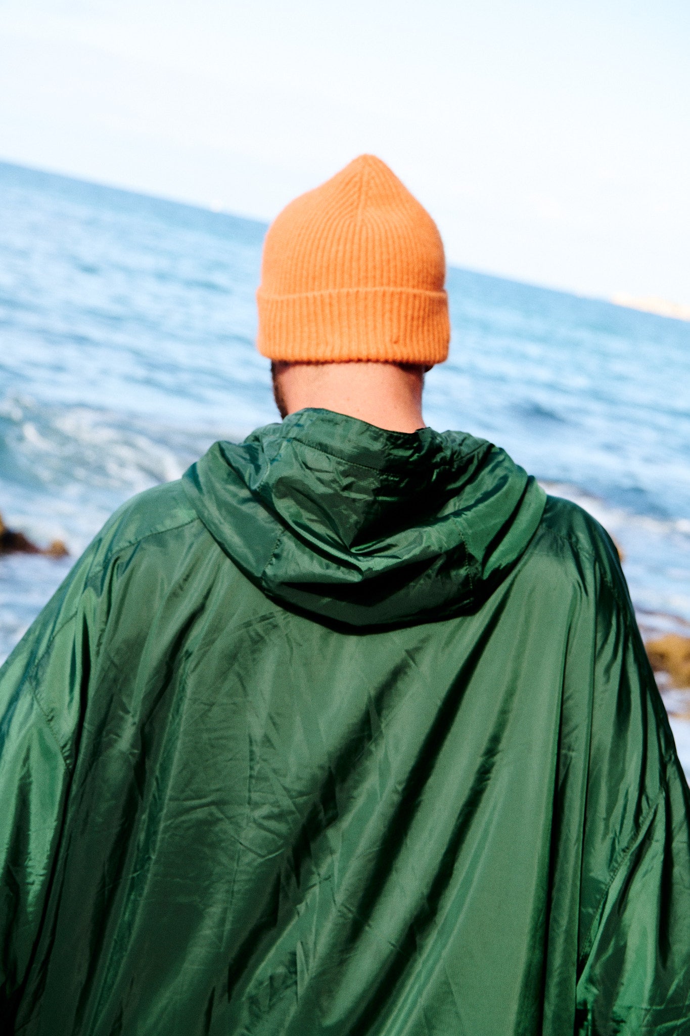 Notre poncho : à l'intérieur matière nid d'abeille : super absorbante. A l'extérieur matière coupe vent.